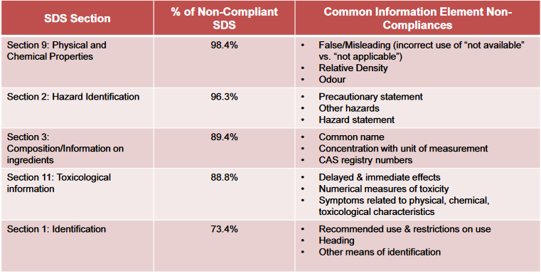 As part of its compliance and enforcement efforts, Health Canada performed a Safety Data Sheet Audit Project and reviewed 188 publicly available SDSs to determine HPA and HPR compliance. While not yet finalized, the preliminary findings determined that these sections of the SDS had the following prevalence of non-compliance: