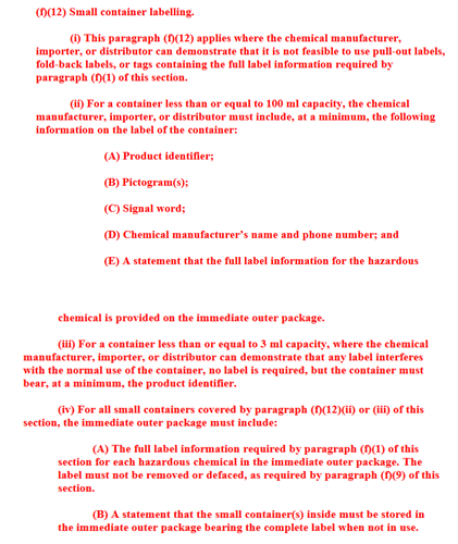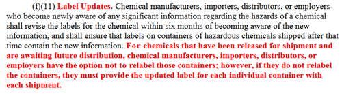 In response to many comments received from the regulated community, OSHA made some major updates to the Labeling requirements found in (f)(11) and (f)(12) of the revised standard. In the below excerpts, the redline text is what's been revised/added since the revision from the 2012 standard: